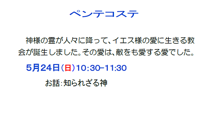 教会は「心のオアシス」として、どなたにも、いつでも開かれています。慰めの言葉、励ましの言葉、癒しの言葉が、ここにあります。まだイエス・キリストや聖書のことをあまりよく知らないという方も、少し聞いたことはあるけど信じていないという方も、大歓迎です。どの集会でも気軽にお越しください。あなたのおいでを心からお待ちしています。